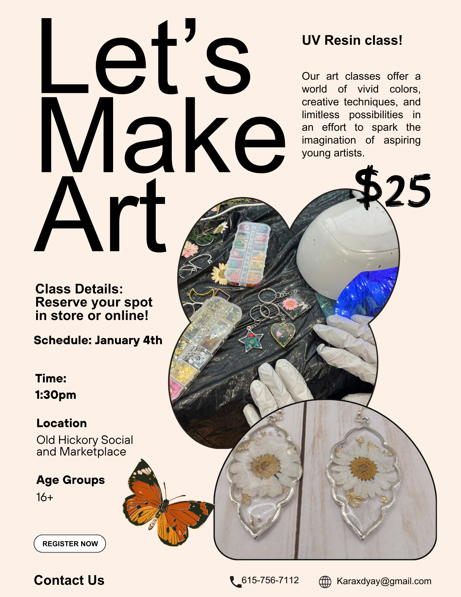Hey there, art lovers! Get ready to dive into the mesmerizing world of UV Resin art! Join us on January 4th at 1:30 PM at Old Hickory Social and Marketplace for a hands-on class where you'll learn to create stunning, crystal-clear masterpieces. This class is perfect for ages 16 and up, whether you're a seasoned artist or just starting out. Unleash your creativity and discover the magic of UV Resin as you craft unique jewelry, decorations, and more. Spaces are limited, so reserve your spot now and let's make art together!